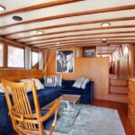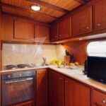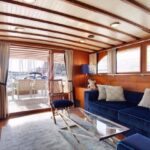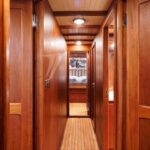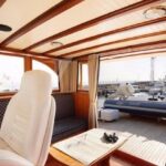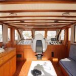 – Coque et superstructure construites en bois massif Ossature et fasciame de 40 mm en acajou, recouverte de teck massif, intérieurs en cerisier avec finition satinée